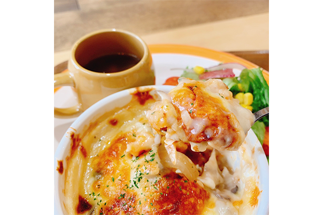 バターライスにシーフード、キノコの旨味たっぷりのホワイトソース、チーズをのせて焼き上げました。