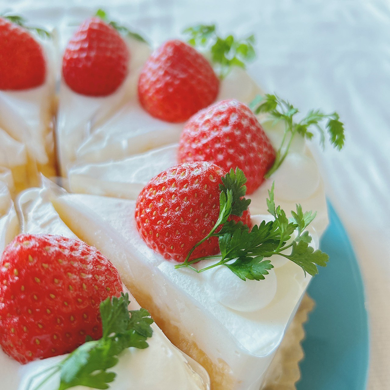 高級卵使用。ふわふわに焼き上げたスポンジ生地に旬の苺をたっぷりサンド。
